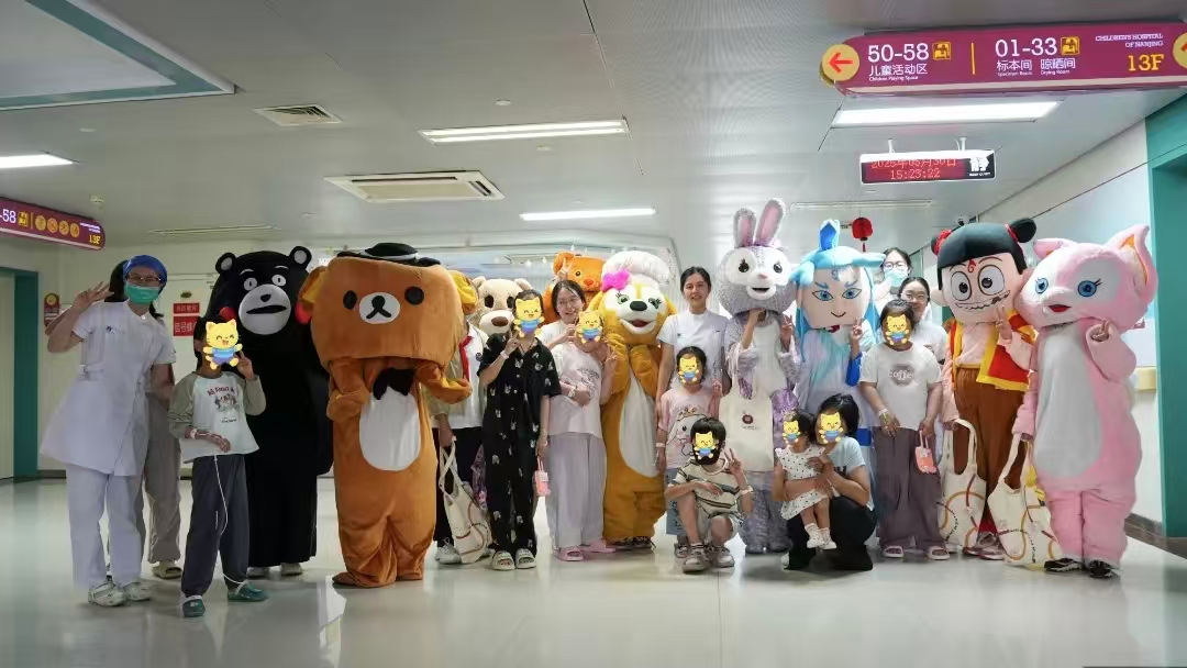 來自南師附小的學(xué)生志愿者們身著可愛童趣的卡通人偶服裝,化身成為孩子們喜愛的動(dòng)畫角色,與住院患兒互動(dòng)交流,希望緩解孩子們住院治療期間的緊張情緒。志愿者們還為每位住院患兒送上了節(jié)日禮物,每一份禮物都飽含著對(duì)孩子們?cè)缛湛祻?fù)的美好祝愿和真誠(chéng)祝福。