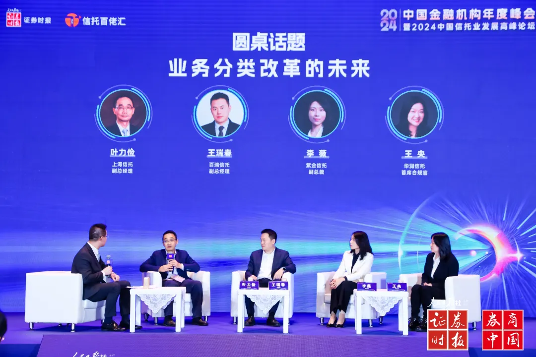 近日,在證券時報主辦的“2024中國金融機構(gòu)年度峰會暨2024年中國信托業(yè)發(fā)展高峰論壇”上,在主題為《業(yè)務(wù)分類改革的未來》的圓桌論壇環(huán)節(jié),圍繞著具有劃時代意義的業(yè)務(wù)分類改革,上海信托副總經(jīng)理葉力儉、百瑞信托副總經(jīng)理王瑞春、紫金信托副總裁李薇及華潤信托首席合規(guī)官王央等四位行業(yè)高管展開了深入細致的交流探討。
